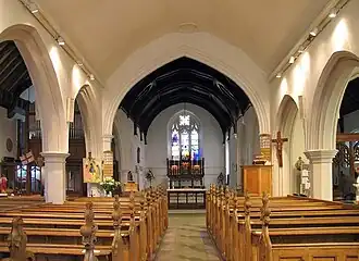 The church contains a number of stained glass windows, including work by Frederick Preedy, Franz Mayer & Co. and James Powell and Sons. The chancel reredos and lady chapel screen were designed by Geldart and the war memorial by Nicholson. The 15th century font was originally at St Swithin's Church in Norwich.[3]