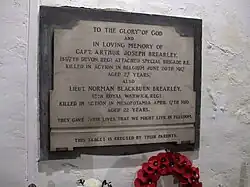 Situated in the North aisle is a private First World War Memorial to Captain Joseph Arthur Brearley and his brother Norman Blackburn Brearley, son's of Harry and Annie Brearley, of 225, Charles Rd., Small Heath, Birmingham. Arthur, after being educated at King Edwards Grammar, Handsworth and Emmanuel College, Cambridge, became a schoolteacher in Exeter and joined the 1/6th Cyclists Battalion of the Devonshire Regiment in April 1914.[32] He became attached the Special Co N Royal Engineers whose role was the firing of gas canisters onto enemy trenches. He was killed on 20 June 1917 during the Battle of Messines Ridge, and the Battalion War diary records, "Gas discharged on Jackdaw and Jam Avenue. Observations from the front line indicates that drums burst well and a good cloud was formed over enemy trenches. Considerable hostile artillery retaliation on front line and C.T.'s. Golden rain,double red and double green lights were used extensively by the enemy. Whole operation including preparation 3 killed 11 wounded." He was 27 and had been with N company just over a month.[33] His brother, Norman Blackburn Brearley was with A company, 9th Battalion Royal Warwickshire Regiment and was killed in action on 19 April 1916. The battalion War Diary records at 0700 whilst attacking a Turkish Trench at Beit aiessa, on the right hand bank of the Tigris. He was seen to be hit during the charge and fell in marshy ground, the water rose and he, and others with him, were drowned before aid could reach them.[34] He was 22 and is commemorated on the Basra Memorial.[35] There is the following inscription on their memorial