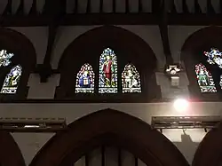 Inside, a set of excellent stained glass windows.[8] being of good-quality, intact and an extensive scheme of stained glass, designed by Hardman & Co.[6] who were also responsible for the stained glass in the Houses of Parliament. Those in the North aisle are illuminated allowing them to be viewed despite them having no natural light being enclosed as a security measure. The restoration was made possible by a donation from a late parishioner and the windows blessed at Easter 2010 with the following words; Almighty and eternal God, we give you thanks and praise for these stained glass images of your saints. For as often as we look on these images with our bodily eyes, As we look at them may we consider the actions of your saints and think about their sanctity for our inmitation. Bless and sanctify these windows made in honour and in memory of your only begotten Son, our Lord Jesus Christ and of these saints. We also remember our faithful servant John Ellison in whose memory these lights were re-installed. May the light of Christ always shine in our hearts. Amen[14]