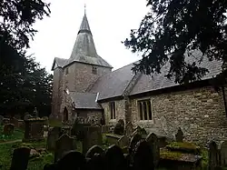 The church is built of Old Red Sandstone rubble.[4] It comprises a nave with west tower, chancel, aisle and porch.[4] The architectural historian John Newman, in his Gwent/Monmouthshire volume in the Buildings of Wales series, described the "broad and squat" tower as the church's the most memorable feature.[5] The interior contains some monuments of "unusually high quality" which are noted in the church's listing record for its Grade II* designation.[4]
