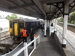 The station buildings are constructed of granite in an 'L' shape west and north of the St Ives bay platform. The booking office is staffed for part of the day and is located in the west-facing section which faces the station car park. The northern range incorporates staff accommodation as well as refreshment facilities which appeared in a list of the ten best station cafes published in The Guardian in 2009.[12] Platforms 2 and 3 have a long canopy above them to protect passengers waiting for their train. At the west end of this is a covered footbridge which links with the main westbound platform for trains to Penzance, and a large wooden shelter is provided here. A small granite building further up the platform is for staff use. As with several other stations in Cornwall, small palm trees grow on the main platforms, both of which can accommodate seven-coach trains.[13]