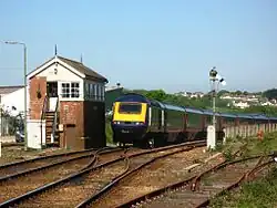 The signal box is situated at the east end of the station between the main line and the St Ives branch. It was opened on 10 September 1899 when the main line was doubled to Hayle and replaced an earlier box that dated from around the time of the opening of the St Ives branch. Semaphore signals still control movements around the station. The signal box also controls trains on the St Ives branch.[10]