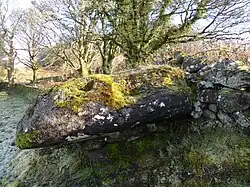 Also known as St Fillan's Chair or Pulpit (NS 38396892), this whinstone block is located against the drystone dike on the western side of the lane. It is a natural boulder that faces south and overlooks the Kirk and a field, in the corner of which stands St Fillan's Well. A circular hollow forms a south-facing seat and to the right-hand side is a smaller oval hollow. Local tradition records that St Fillan sat in this chair, preached and baptised converts and babies with holy water from the cup that had been collected from the nearby well.[11] It is also said to cure rheumatism with the afflicted person first sitting on the seat and then being hauled down the hill by their feet to conclude the cure, although this may be a confusion with another Scottish St Fillan's Seat.[12] Old engravings show that the soil level at the area of the seat has been significantly eroded through rainfall and the actions of cattle and horses.[13][14]