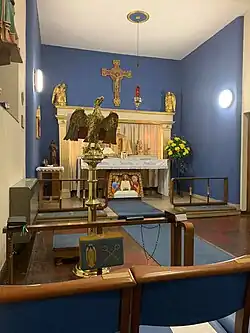 During construction, the parish began assembling the necessary furnishings and fittings, from hymn boards and kneeling mats to more significant items like the processional cross, sanctuary lamps, and altar vessels. One notable feature was the installation of a carillon of tubular chimes, the first of its kind in the country. Operated from a small keyboard, the chimes were housed in a sound-insulated cupboard, with their sound amplified and broadcast outside via a microphone system. However, the carillon required frequent maintenance and was eventually taken out of use, though it remains in its original cupboard. The original Hammond electric organ, on the other hand, proved to be a reliable fixture, serving the church for nearly 40 years with minimal issues.[2]