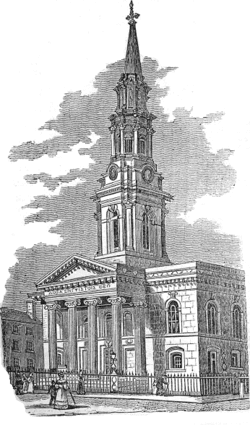 Construction of the "New St. George's church, Drumcondra", at the end of Temple Street, Dublin (the street so named after the church) commenced in 1802 by the Church of Ireland for the parish of St. George, which had been established in 1793. There had been an "Old St. George's church, Drumcondra", in nearby Hill Street (the called Lower Temple Street) erected by Sir John Eccles.[5] The Eccles family were patrons of the "new church". Another "Drumcondra Church" is the St. John the Baptist Church, in Church Street, Dublin.