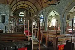 St Germanus' is built in rough slate rubble, with granite dressings. The slate roofs were added in the 19th century. The church is made up of a nave and chancel, west tower, south aisle and south chapel, north porch, north transept and north vestry.[2] Some of the internal fittings include a 14th-century octagonal font, pews of late 15th-century origin, a late 19th-century organ loft and a screen made by Herbert Read of Exeter in c. 1930. There are monuments to Mary Ashton (and other members of the family), dated 1664, John Batterby (1672), Roger Ashton (1677) and Stephen Edwards (1797).[2] The church has no electricity, gas or water, and services are lit by candlelight.[4]