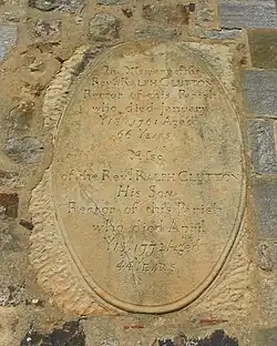 Also buried in the churchyard is Henry Piggott, a member of the locally prominent Piggot(t) family. His "seemingly very odd memorial"[9] by the southwest corner of the chancel[47] states that he was born on 30 December 1715 and died on 7 March 1715.[34] The gravestone is an example of the use of Old Style (Julian calendar) dates in the period before 1752, when the Gregorian calendar was introduced. The new year started on 25 March rather than 1 January, so Henry Piggott lived for about nine weeks.[9][34][47]