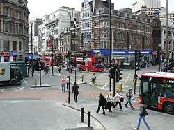 Tottenham Court Road Underground station was opened in July 1900 as part of the Central London Railway, with the platforms under Oxford Street to the west of St Giles Circus, and the station opening on the south west side of the circus, on Oxford Street.[4] The Charing Cross, Euston and Hampstead Railway joined the station with what is now part of the Northern Line in September 1908, with station entrance on the south east side of the circus.[5] The main station ticket hall was later moved underground, built below the circus in the 1920s.[6] The junction became known as St Giles Circus in 1921.[7]