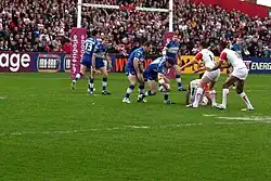 In 1895 the club were one of 22 clubs that resigned from the Rugby Football Union and established the Northern Union.[3] The first match of the new code was an 8–3 win at home to Rochdale Hornets before 3,000 spectators, Bob Doherty scoring St Helens' first try.[6] They played in a vertically striped blue and white jersey—a stark contrast to the well known broad red band which would become the kit for the club later. The club reverted to this kit for one season during the rugby league centenary season in 1995.