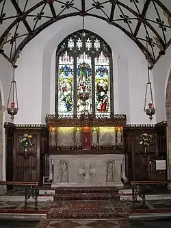 The font is of granite and most likely of the 15th century. It is carved with four angels holding shields. In the chancel, there are bench ends of the standard design and two other, complete benches. There is a brass to a member of the Trenwith family, 1463, and a monument to the Hitchens family by Garland & Fieldwick, 1815.[3]