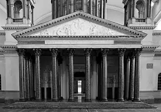 The cathedral took 40 years to construct, under Montferrand's direction, from 1818 to 1858.[8] To secure the construction, the cathedral's foundation was strengthened by driving 25,000 piles into the fenland of Saint Petersburg. Innovative methods were created to erect the giant columns of the portico. The construction costs of the cathedral totalled an incredible sum of 1 000 000 gold rubles. Under the Soviet government, the building was stripped of religious trappings. In 1931, it was turned into the Museum of the History of Religion and Atheism, the dove sculpture was removed, and replaced by a Foucault pendulum.[8][9] On 12 April 1931, the first public demonstration of the Foucault pendulum was held to visualize Copernicus's theory. In 1937, the museum was transformed into the museum of the cathedral, and former collections were transferred to the Museum of the History of Religion (located in the Kazan Cathedral).[10]