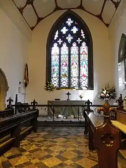 The east window has four lights, and stained glass by William Wailes. Re-set into the internal walls are late Norman architectural fragments.[2] They form a random collection and, other than the possible arch of a priest's door, were set into the walls of the former church. These may have originally formed part of one or more earlier churches and have been used in reconstructing the chapel at Boroughbridge, perhaps after a raid by Scots in the early 13th century.[4]