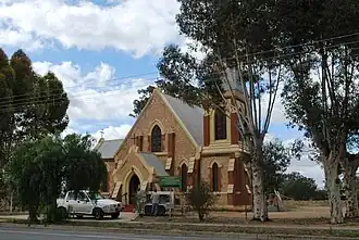 On 14 August 1874 the foundation stone of the rectory was laid by Mrs William Crozier of Moorna Station, and at the same time a wooden schoolhouse and meeting room (parish hall) was opened.[1] In 1986 the Heritage Branch was contacted in relation to a proposal to purchase the rectory for demolition to provide car park spaces for the adjoining services club.[1]