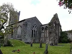 The roofless remains of the chancel of the old priory church with a seven-light east window (c. 1250). Inside the ruins are late mediaeval tombs including the altar tomb of a Purcell couple (1500) with carvings of the Crucifixion and the Apostles. The effigy of the lady wears a long flowing robe and a horned headdress.[8][9]