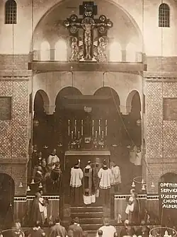 The architect, George Drysdale, needed to design as large a church as possible on a triangular site, symmetrical in design and within the funds available. It is built of red brick and tile, stone only being introduced into the floor and doorways. At the west end is a narthex and two altars, one each in the Lady chapel and the Chapel of Holy Souls occupying the full width of the church at this end. There is a graduated decrease in the building's width towards the high altar which occupies a semi-circular position at the eastern end. The sanctuary is raised above the level of the nave while the altar is of a greyish-green marble, the original communion rails – since removed – being of the same marble relieved with a band of yellow marble and bordered with black marble. There is a semi-circle of five columns of black marble with capitals of carved white marble above which are open arches.[6]