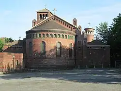 It is built of red and purple bricks. In the north-west corner there is a campanile with four stages of slightly diminishing height, each decorated with blank arcading, and an open arcade on the upper stage. There is a round tower, lower then the campanile, in the north-east corner, with an open arcade on the upper stage. Between the campanile and tower, the side facing Hall Street is gabled and has a wide-arched central doorway with stone columns; there are three windows above, with similar arches and columns.[2][3]