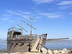 | A castle at the playground (and zipwire on right) | Tunnels and slides at the playground "volcano" | A children's "pirate ship" on the waterfront |