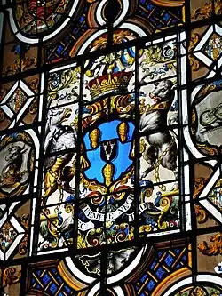 Fixtures include a marble font which is contemporary with the church.[29] There is much stained glass: the oldest, in the form of heraldic emblems in cartouches, dates from 1562 and is visible in the Diocletian window in the east wall and in another window on the southwest side.[29] The east window was erected in memory of Sir Frank Stapleton, rector of Mereworth 1832–74.[31] Other similar glass dates from the 17th and 18th centuries. Another, depicting the Raising of Lazarus, was designed by Frederic Shields for the Heaton, Butler and Bayne firm in 1889.[26][29]