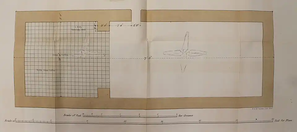 In the chancel, two stone coffins were discovered at the excavation along with many skeletons, which were arranged radially, like the spokes of a wheel, with the heads close to each other at the central point. Outside the chapel were found two slabs marked with crosses and one with shears. Many other skeletons were found in the area around the chapel along with coins from the reigns of David II, Robert III, Mary, and Charles II. Near the east end of the chapel, a red sandstone plinth of around 2 m (6 ft) diameter was found with a hole for the bases of a cross. This was broken up for rubble in 1855.[b][4][8][43]