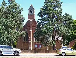 St Luke's is built of red brick, with dressings in Bath stone and roofs of blue slate, in the Early Gothic style. It was designed to accommodate over 300 persons,[4] and is made up of a nave, chancel, south transept, vestry and south porch. The turret on the west gable contains one bell. Internal fittings include a stone font, oak lectern and reading desk. The benches and chairs are carved from deal. The church's floor was laid with concrete and wood, and the chancel paved with encaustic tiles from Minton, Hollands and Co.[5]