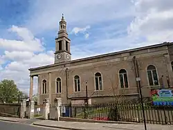 The builder was Mrs Elizabeth Broomfield of Walworth and the foundation stone was laid by the Archbishop of Canterbury on 14 April 1823. The church was consecrated by the Bishop of Winchester on 25 July 1825.[10] The main front, in a rather simplified version of the Corinthian order, has a stone portico with six fluted columns. A tower rises in three stages from the roof just behind the portico.[10] The church is very similar in appearance to St John's, Waterloo, and to two other churches by the same architect: St George, Wells Way, Camberwell, and Holy Trinity, Trinity Square, Southwark.[11]