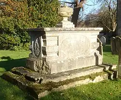 A large table tomb at the west end of the churchyard is listed separately by English Heritage as a Grade II-listed structure. Dating from about 1800, it contains the remains of George and Mary Hutchinson. The structure is of pale (but heavily weathered) stone, including a two-step plinth, with various inscriptions on the sides, topped with a carved urn decorated with putti. The Grade II listing was given on 23 February 1983.[23]