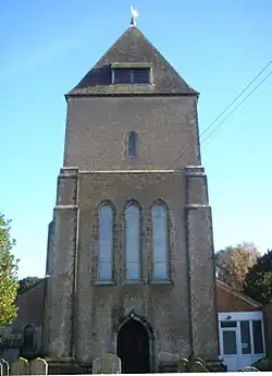 Architectural historian Nikolaus Pevsner considered the tower to be "perplexing", but described its windows and double internal arch as "odd and very effective details".[20] Unusually, it is rendered with roughcast in the same way as the body of the church,[8] producing a "heavy" effect.[20] It has three tall lancet windows on the lower stage, and a much smaller lancet above.[20] The three lancets depict the Resurrection, Crucifixion and Ascension of Jesus Christ respectively.