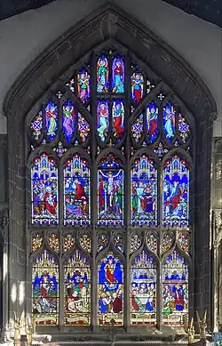 Reconstructed at least four times in its history, most notably in the 15th century, the present structure was described by the antiquarians John Leyland and John Nichols as "the fairest parish church in Leicester"[5] while Nicholas Pevsner noted that its vaulted double height south porch and the towers stair turret are both unique in Leicestershire.[6] Today, thanks both to its monumental perpendicular tower and its location opposite Leicester's busiest bus station, it is one of the city's most recognisable historic structures. It is also noted across Leicestershire and the wider East Midlands for its large peal of 14 bells, ten of which have been in the tower since the 17th century.[5] It is a Grade I Listed Building[7] and a member of the Major Churches Network.