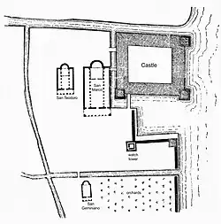 A series of fortifications was consequently erected during the reign of Doge Pietro Tribuno (in office 887–911) to protect Venice from invasion by sea.[7] These fortifications included a wall that started at the rivulus de Castello (Rio del Palazzo), just east of the Doge's Castle, and eventually extended along the waterfront to the area occupied by the early Church of Santa Maria Iubanico.[note 1] However, the exact location of the wall has not been determined nor how long it was there beyond the period of crisis.[note 2][note 3]
