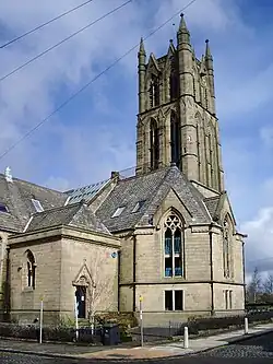 The tower is tall, is in four unequal stages, and has a narrow octagonal stair turret at the southeast corner. In the third stage are two tall and narrow two-light windows on each side. On each side of the top stage are two two-light louvred bell openings rising into gables which break through the parapet. The parapet is pierced, and at the corners of the tower are pinnacles.[1][8] Comparing the tower with the tall steeple of St Walburge's, the architectural historian Nikolaus Pevsner says that it "tries to complete with the steeple of St Walburge in prominence and to defeat it by solidity and sensibleness".[6] In converting the church for residential purposes, balconies have been created and new windows have been added.[8] The former school building has been converted into a design studio and occupied by Heckford Advertising Agency since 1990.[9]