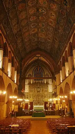 The church floor lies six feet below street level, creating an architectural illusion of being larger internally and from the entrance there is an unimpeded view across the nave and into the chancel. Octagonal stone columns topped by brick arches separate the aisles from the nave; above these arches are a series of clerestory windows. A large series of stained windows dominates the west wall.[6] A series of 144 painted shields adorn the nave ceiling, representing the Anglican missionary dioceses founded within 100 years of the church.