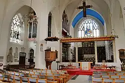 The organ is a fine three-manual Norman and Beard organ.[4] There is a two-level reredos above the altar with small statues of saints.