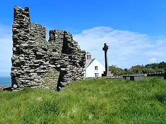 The ruins of the Abbey of St Mary, stand at the northern end of Bardsey Island, south-west of the Lleyn Peninsula, in Gwynedd, Wales. The site has had religious importance from at least the 6th century when Saint Cadfan founded an abbey there. In the following centuries the island became an important place of pilgrimage and 20,000 saints are reputedly buried on the island. By the end of the Middle Ages the abbey had declined in importance and, following the Dissolution of the monasteries, fell into ruin. In the 18th century, more substantial remains were still standing, but by the 20th only the current remnant of a tower remained. The ruins are a Grade II* listed building and a scheduled monument. Three Celtic crosses set among the ruins are listed at Grade II.