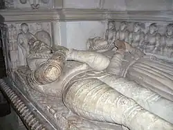 The chancel roof is dated 1571, and the nave roof 1598. All the chancel windows internally are shafted in Purbeck marble. In the chancel is a large double piscina, and a trefoil-headed aumbry. There is also a large piscina in each of the transepts. The font is octagonal and dates from the 13h century. The pulpit was created in the 19th century from Jacobean pieces. The north transept is floored with medieval tiles. The walls of the south transept are decorated with 13th-century painted red rosettes. In the north wall of the chancel is a stained glass window of 1927 designed by A. K. Nicholson. In the north transept are monuments, the oldest of which is dated 1382. A later monument dated 1632 is by Nicholas Stone.[3] The two-manual pipe organ is located in a chamber to the north of the chancel. It was built in 1973 by Ward and Shutt.[4] A marble plaque in the north transept commemorates Lieutenant Walter Smythe, who was killed at the siege of Mentz when serving in the Austrian army in the French Revolutionary Wars (1794), with carved figures of cannon, cannonball, drum, flags and a castle.[5] Also inside the church is a plaque listing parish men who died serving in World War I while in the north porch a painted wooden plaque lists all who served in the same war, with indications of those who were wounded or died.[6]