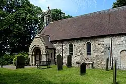The oldest part of the church is a Saxon doorway in the west wall of the vestry, but this was reassembled in the 19th century from parts found embedded in the north wall. The current church was built in the 12th century, with walls of limestone and sandstone. The south wall survives, with three windows, a doorway and a buttress. A porch was added in 1879, and this covers the entrance to another Norman doorway. This has a zigzag moulding, the teeth ornamented with leaves.[1][2]