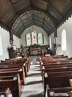 In the 19th century, the north wall was rebuilt, the west gable was restored, and a vestry was added. In the west wall is a doorway with no ornament other than plain imposts, described by Nikolaus Pevsner as "very unusual". Atop the roof is a bell turret. Inside, there is no division between the nave and chancel. On the south side of the chancel, one window has stained glass, designed in 1879 by C. E. Kempe. The chancel ceiling dates from about 1890, and was designed by Temple Moore.[1][2]
