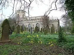 The lych gate built in 1891 is listed at Grade II.[10] In the churchyard the box tomb of Samuel Brady dated 1814 is also listed at Grade II.[11] In 1958 a cross base for twin Anglo-Saxon crosses was discovered in the churchyard. It is listed at Grade II,[12] and is a Scheduled Monument.[13] The churchyard also contains the war graves of six soldiers of World War I, and a Merchant Navy Master, an army officer, and a sergeant of World War II.[14]
