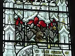 In the north wall of the nave is a large Norman recess.[3] In the east wall of the chancel is a 14th-century aumbry and piscina. The tub font dates from the 12th century. The pulpit is simple, and in Jacobean style. Otherwise the fittings and furniture are from the 19th century. Above the west window is the coat of arms of George III dated 1806. On the walls of the nave and chancel are traces of medieval and post-medieval paintings. One of the windows in the south wall of the nave contains fragments of 15th-century stained glass; the rest of the glass dates from the 19th century.[2] There is a plaque to Lieutenant Franklin Knight Kirby, 93rd Highlanders, who died of typhus during the Crimean War, and another in stone to Major Frederick Raymond Clegg-Hill, killed in World War II.[4] The two-manual pipe organ was built by J J. Binns, and was restored in 1975.[5]