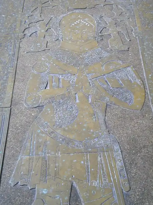 The brass memorial to Sir Hugh Hastings (died 1347), the largest of all English church brasses, has been described by Nikolaus Pevsner as “the most sumptuous of all English church brasses”.[12] With some parts missing, it shows a 5 feet 6 inches (1.68 m) long figure in armour with hands together in prayer while two angels hold his pillows. In the cusped arch above tiny angels receive his soul. In a gable above this is a mounted St George spearing a devil in an octofoiled circle. Above this are two plaques with the Coronation of the Virgin between two angels in the corners. To the left and right four tiers of mourning figures represent Edward III, Thomas Beauchamp Earl of Warwick, Lord Grey of Ruthyn, Henry Plantagenet Earl of Lancaster, the Earl of Pembroke, Hugh le Despenser, Ralph de Stafford, and Almeric, Lord St Amand. Pembroke and Despenser are now missing.[6][13]