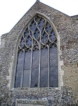 The church is built of flint with stone dressings and stands at the centre of a rectangular churchyard. The tower at the western end has battlements with an early example of flushwork panelling. The bell openings have reticulated tracery, with two minor reticulation units within the major one.[6] The nave, without pillars or aisles, is nearly 40 feet (12 m) wide, the widest among Norfolk's parish churches, giving a large preaching space as pioneered by the mendicants.[10] The nave and chancel have battlemented parapets and a pantiled roof built in 1781, supported by kingposts on arched ties, which solved earlier problems caused by the width of the nave. The nave has three large three-light windows on each side with Curvilinear tracery based on the petal motif. The west door is of Perpendicular style opening into the nave through a tall narrow tower arch. There are both north and south doors with porches, all having boldly cusped ogee arches. The floor is of buff pamment stone.[6]