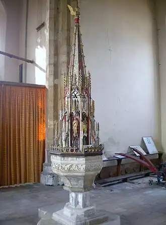 The single-stemmed Decorated style octagonal font has each wave of a frieze filled with an ogee trefoil and with battlements above.[6] Suspended by a rope from the roof above is a tall and highly ornate font cover in Perpendicular Gothic style with carved figures, some original, in niches between diagonal pierced vanes with rich crocheting topped by a spire and winged angel.[14]