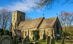 The church is built of sandstone with a slate roof, and consists of a nave, a north aisle, a south porch, a chancel, a north vestry and a west tower. The tower has two stages, angle buttresses, a two-light mullioned window with a hood mould, two-light bell openings with hood moulds, and an embattled parapet.[3][5]