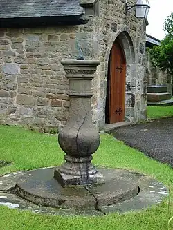 The gravestones in the churchyard include one dated 1668.[1] There are war graves of four soldiers of World War I and one of World War II.[7] To the south of the church there is a sandstone sundial which has two circular steps with a pedestal shaped like a vase; there is plate attached which is dated July 1746 and bears the name of the Rev. C. Swainson.[3] It has been designated as a Grade II listed building.[8] South of the chancel is the sandstone base of a preaching cross from the late Middle Ages. The cross base also has a Grade II designation.[9]
