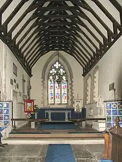 Fittings include a 13th-century piscina in the south wall of the chapel, a 15th-century octagonal font, medieval stalls and very mixed panelling in the nave pews. On the south wall of the nave is a large wall painting of St. Michael weighing souls dated to around 1350.[1]