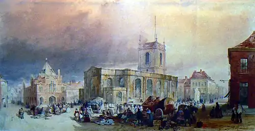 A fire in 1291 destroyed most of the town including its churches.[2] St Mary's was rebuilt in the 14th century. This medieval church consisted of an aisled chancel, an aisled nave, a west tower and a spire.[2] The tower is believed to have been built in 1356.[2] It was at this time that St Mary's achieved a special prominence in the city as the church of the guild of St Mary and St John the Baptist, founded in 1387 by the amalgamation of two existing guilds. This guild ran affairs of the city until 1538.[2]