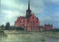 The previous church was built in 1887, and designed by the Lancaster architects Paley, Austin and Paley. Two local industrialists donated £5,000 (equivalent to £700,000 in 2023)[2] each to its cost. The church was built in red brick, and was distinguished by having a bellcote at the east end by a tall, slender spirelet. It was also unusual in that it had narrow aisles, forming passages down the sides of the church. The church was built on a coalfield, and subsequently suffered damage from subsidence, which led to its demolition in 1978.[3] Pollard and Pevsner in the Buildings of England series describe it as having been a "grand" church.[4] Brandwood et al state that the practice designed a number of urban churches around this time, and they consider that this was the most important, with "real character and individuality".[5]