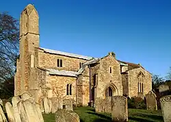 The church dates from the 12th century and doesn't have a tower.[2] The 14th-century south porch has a parvise not connected to the body of the church. It also has two scratch dials. There is a double bell-cote[3] on top of the 13th-century west front.[4][5]