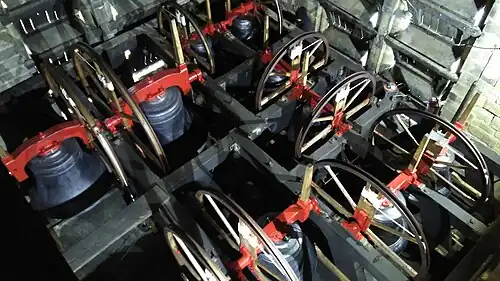 The bells have been overhauled several times since their installation; firstly in 1934 by John Taylor & Co, who replaced the plain bearings with ball bearings, overhauled and repaired the fittings and strengthened the frame at a cost of £238. A second overhaul took place in 1983, also by Taylor's, following an inspection report earlier that year, who reported that "tonally, the bells leave a great deal to be desired". They proposed a full restoration involving retuning and rehanging the bells at a cost of £7,560; this was not acted upon. Instead, the treble and 4th bells were brought to their works, were retuned and rehung on new metal headstocks; the other 8 bells remained untouched on their 1869 wooden headstocks.[24][25]