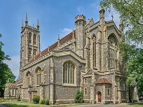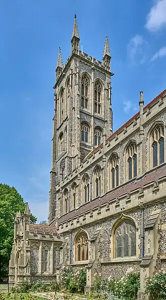 The church was designed in the Neo-Perpendicular Gothic style and features a west tower, an aisled nave of six bays, north and south porches, chancel, and lady chapel. There are vestries towards the east end of the church, as well as lean-to narthexes on the north and south faces of the tower.[4] The church is 210 feet (64 metres) long.[3]