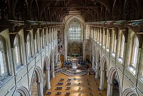 The nave has a spectacular hammerbeam roof, the supports for which start midway up the clerestory buttresses. The roof is made out of oak and features gilded bosses.[13]
